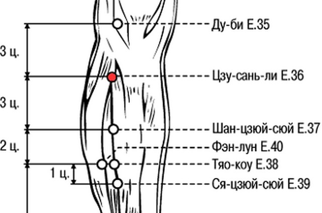 В концепции традиционной китайской медицины точка Цзу-сан-ли расположена на меридиане желудка и регулирует работу органов нижней части тела, включая надпочечники. Считается, что стимуляция этой точки: